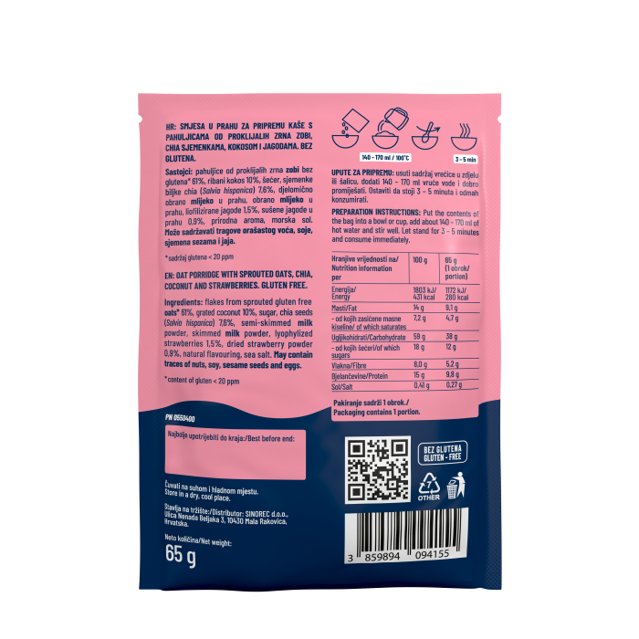 Smjesa u prahu za pripremu kaše sa pahuljicama od proklijalih zrna zobi, chiasjemenkama i jagodama. Bez glutena.